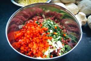 Alle Zutaten bereitstellen, die Pilze säubern und putzen. Die Stiele herausschneiden oder herausbrechen. Für die Füllung die Paprikaschote und Lauchzwiebel in kleine Würfel schneiden. Die Knoblauchzehen schälen und klein hacken. Die Chilischote sehr klein schneiden, die Petersilie fein hacken. Das Hackfleisch in eine nicht zu kleine Schüssel geben. Die Füllung, das Hackfleisch mit den Paprikawürfeln, 2 Lauchzwiebeln, einer Knoblauchzehe, 2/3 Petersilie, den Gewürzen und ca. 2/3 vom Mozzarella gut vermischen