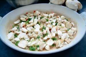 Die Pilzreste kannst du mit der Petersilie, einer Lauchzwiebel und einer klein gehackten Knoblauchzehe und der Sahne in eine Auflaufform geben und etwas mit Salz und Pfeffer würzen