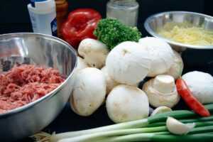 Die Füllung, das Hackfleisch, mit angefeuchteten Händen oder einer Gabel in die Champignons füllen.