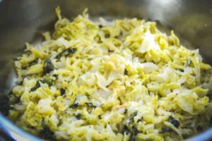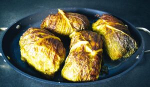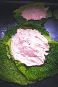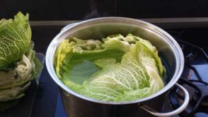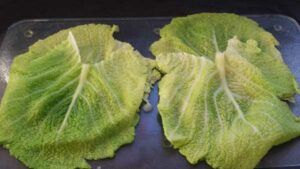 Wirsingblätter danach sofort kalt abbrausen und gut abtropfen lassen, am besten legst du sie zwischen 2 Lagen Küchenkrepp.