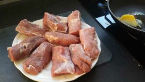 Stelle dir deine Zutaten bereit, das Schweinefilet von Fett und Sehnen befreien, die Abschnitte für später an die Seite legen.