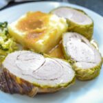 Das fertig gebratene Schweinefilet im Wirsingmantel mit der Soße servieren.