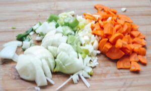 Die Zwiebel, Möhre und Knoblauchzehe schälen und kleinwürfeln