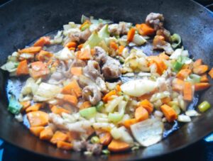 die gewürfelten Zwiebeln. Möhre, Knoblauch und Lauchzwiebel mit den Filetabschnitten kräftig anbraten und mit der Hühnerbrühe oder Hühnerfond ablöschen. Den Sud mit dem Gemüse zu den Rouladen geben.