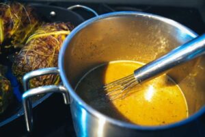 Den Sud aus der Auflaufform in einen Topf gießen, mit Salz und Pfeffer abschmecken und mit dem Mixstab klein mixen und pürieren, den Senf darunter rühren mit etwas Speisestärke binden
