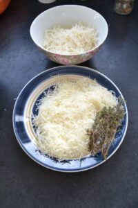 Den geriebenen Käse mit den gezupften Thymianblättern, Maizena und der Sahne alles gut verrühren