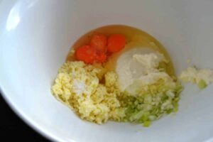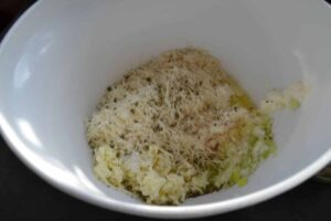 Den Ricotta mit den Eiern , Lauchzwiebel und dem geriebenen Mozzarella und den Gewürzen verrühren