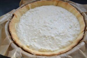 Den Tarteboden wie in meinem Grundrezept für den herzhaften Quiche Tarteteig beschrieben vorher blind backen. Den Ricotta - Käse Guss nun auf den vor gebackenen Quicheboden geben.
