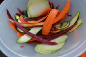 Die Möhren, Zucchini und die Kohlrabi auf einem Gemüsehobel in feine Streifen schneiden. Damit man die Gemüsestreifen gut zu einer Rose rollen kann, müssen sie entweder für 3-4 Minuten in kochendem Wasser blanchiert werden, ich habe sie einige Minuten in der Mikrowelle vorgegart, bis sie sich gut rollen lassen. Ja nach dicke brauchten sie ca. 5 Minuten. Die Zucchini und Kohlrabi brauchen etwas weniger, am besten die Möhren extra garen.