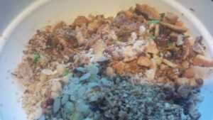 Die Weihnachtsplätzchen in kleine Stücke brechen und zerkrümeln aber nicht zu fein. Die Back Oblaten entfernen. Nun die Plätzchen mit 1 Pinnchen Rum tränken