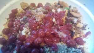 Zu der getränkten Plätzchen Masse kann man noch Kirschen zugeben.