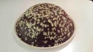 Wenn die Kuvertüre leicht angezogen hat den Kuchen mit den Mandel Blättern bestreuen .