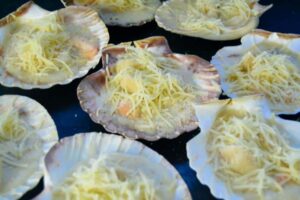 die gefüllten Jakobsmuscheln mit etwas Paniermehl