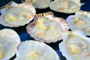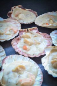 Leckere gratinierte Jakobsmuscheln Rezept mit frischen Garnelen und gedünsteten Champignons in einer Weißweinsauce. Die Jakobsmuscheln werden in der Muschelschale mit Panko und geriebenem Käse überbacken.