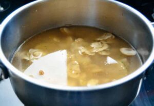 beides anschwitzen und gut verrühren, bis sich ein weißer Film auf dem Topfboden bildet. Den Weißweinsud mit den Champignons