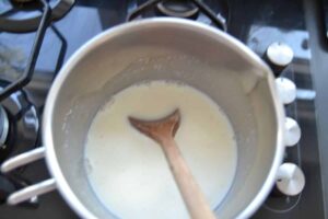 die Milch erwärmen und den Grieß in die Milch geben und rühren, bis er andickt, damit er nicht ansetzt.