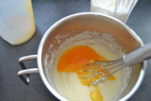 nun den Topf vom Herd nehmen und das Eigelb unter den Grieß rühren.