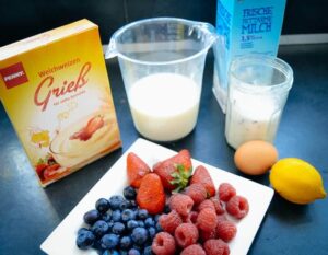 Wenn du auf der Suche nach einer süßen und sättigenden Mahlzeit bist. Oder einen leckeren süßen Frühstücksbrei kochen möchtest, ist Omas Grießbrei Rezept genau das Richtige für dich! Der leckere Grießpudding mit frischen Himbeeren, Blaubeeren, Erdbeeren und Erdbeersoße wird in Gläser geschichtet. Etwas geschlagenes Eiweiß macht den Getreidebrei schön locker.