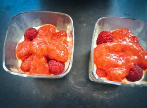 abwechselnd mit dem Grießpudding, mit den Früchten in ein Dessertglas schichten und mit den Früchten verzieren