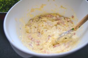 Den Käse entrinden und reiben. Den Käse, die Eier und die Bacon Schalotten Mischung verrühren. und mit Sahne, Crème fraîche und Maizena alles gut vermengen