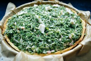 Die Grünkohl Füllung auf den vor gebackenen Tarte Boden geben