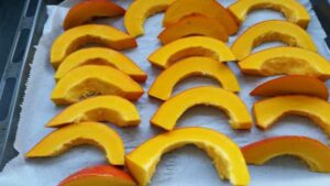ein Backblech mit Backpapier auslegen und die Kürbisspalten darauf verteilen