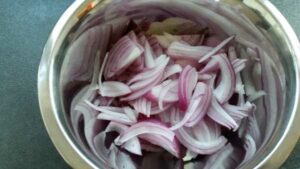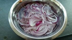 damit die Zwiebeln nicht zu scharf sind, kurz im Wasser schwenken und dann gut abtropfen lassen