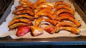 die Kürbisspalten von beiden Seiten mit der Marinade bepinseln, ca. die Hälfte der Marinade. Den Kürbis bei 175 ℃ im vorgeheiztem Ofen ca. 30 Minuten braten. Nach 20 Minuten die Spalten nochmal von oben mit der Marinade bepinseln.