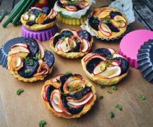 Herzhaftes Mini-Quiches Rezept mit Blutwurst, Apfelrosen und Lauchzwiebel. Die kleinen Quiches haben einen knusprigen Buttermürbeteig Boden der mit Blutwurstscheiben, Äpfeln und Lauchzwiebel und einem Crème fraîche Guss gefüllt wird
