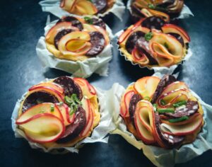 Mini-Quiches Rezept mit Apfelrosen & Blutwurst