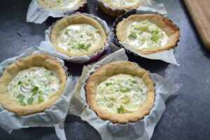bei 180 Grad ca. 10 Minuten blind backen. Das Backpapier mit den Linsen entfernen und weitere 3-4 Minuten backen. Nun können die Quiches gefüllt werden.