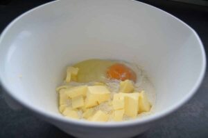 Das Mehl und die kalte in Würfel geschnittene Butter mit dem Ei, Salz und 2 El kaltem Wasser