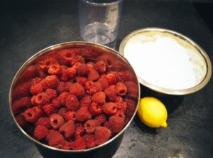 Alle Zutaten bereitstellen, die Himbeeren und den Zucker abwiegen und das Wasser abmessen.