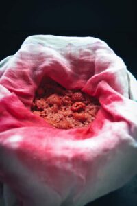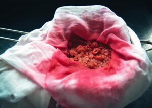 Nach ein paar Stunden oder besser am nächsten Morgen ein Sieb mit einem Baumwolltuch auslegen und die Himbeeren mit dem Wasser