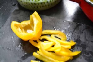 Die Paprikaschote waschen, entkernen und in kleine Würfeln schneiden.