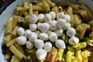 Alle Zutaten bereitstellen, die Nudeln im Salzwasser nach Packungsanleitung kochen. Sie dürfen nicht zu weich gekocht werden. Gieße die Pasta nach dem Kochen in einem Nudelsieb ab und gebe die Nudeln dann in eine große Schüssel und gebe etwas Olivenöl 2-3 El über die Nudeln und vermische es. So kleben die Nudeln nicht zusammen.