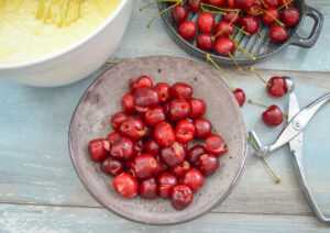 Alle Zutaten abwiegen, den Zucker mit Vanillezucker und dem Vanillepudding Pulver gut vermischen. Die Zitrone halbieren und eine Hälfte auspressen. Die Butter schmelzen, die Kirschen waschen.