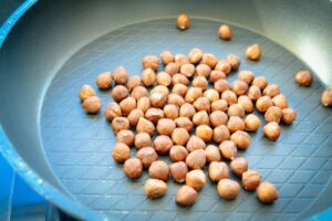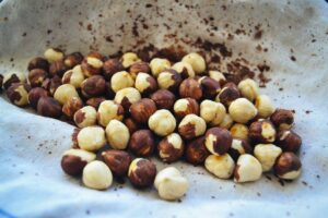 Die heißen Haselnüsse auf ein Küchenhandtuch legen und mit dem Tuch den größten Teil der Schale abreiben