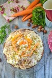 Einfaches Karottenkuchen Rezept mit Frosting: Saftiger Karottenkuchen mit Haselnüssen, knusprigem Krokant und cremigem Frischkäse-Frosting, perfekt für Ostern. Optional sorgen dunkle Schokodrops im Teig für extra Genuss. Alternativ kannst du den Kuchen auch ganz schlicht mit Puderzucker oder einer leichten Glasur verfeinern.