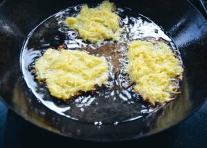 In einer Pfanne etwas Öl erhitzen und entweder einen großen oder kleinere Kartoffelfladen formen. Ich mache kleinere, mit einem Esslöffel Häufchen von der geriebenen Kartoffelmasse ins Fett geben und etwas flach drücken.