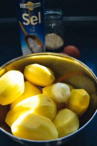 Alle Zutaten bereitstellen, die festkochenden Kartoffeln mit einem Sparschäler schälen