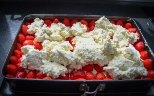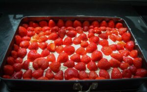 Die halben Erdbeeren in der rechteckigen Form an den Rand stellen und nach innen dann die Erdbeeren auf die Käsesahne legen.