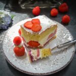 Super einfache und leckere frische Käsesahnetorte mit Erdbeeren. Die Käsesahne Creme wird aus Quark, geschlagener Sahne, Zitrone und Gelatine fix gerührt. Statt einem Biskuit Boden habe ich sie mit einem schnellen Fantakuchen, der einmal durchgeschnitten wird, gebacken. Die Käsesahneschnitten kann man statt mit Erdbeeren auch mit Mandarinen belegen