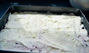 Auf die Erdbeerschicht die restliche Käsesahne Creme streichen, die Creme glatt streichen