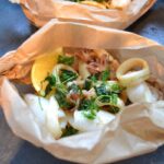 Leckerer knusprig frittierter Tintenfisch, mit einem ganz leichten Bierteig überzogen, dazu etwas frittierte Petersilie und Zitrone und ein Joghurt-Dip