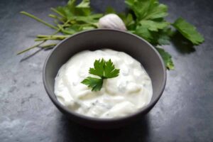 Den Joghurt-Dip kühlen, bis der Tintenfisch frittiert ist.