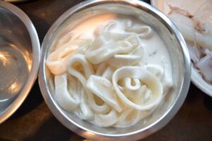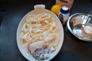 und den Tintenfisch in den Teig geben. Die Fritteuse erhitzen und sobald das Fett heiß ist, den Tintenfisch in einem Sieb abtropfen lassen.