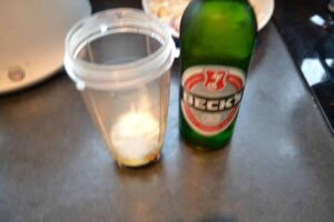 Das Ei mit einem knappen 0,5 TL Salz, dem Mehl und dem Bier in einen Mixer geben und kurz durch mixen.
