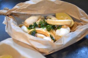 Dann in kleinen Portionen ca. 3 Minuten frittieren und auf Küchenkrepp abtropfen lassen. Im vorgeheiztem Backofen warm halten, bis der komplette Fisch frittiert ist. Vor dem Anrichten die Petersilie für 2 -3 Minuten knusprig frittieren.