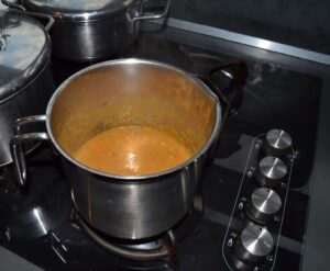 Das Gemüse mit dem Sud und etwas Gemüsebrühe aufkochen und mit dem Pürierstab gut auf mixen und zerkleinern. Mit etwas Salz abschmecken